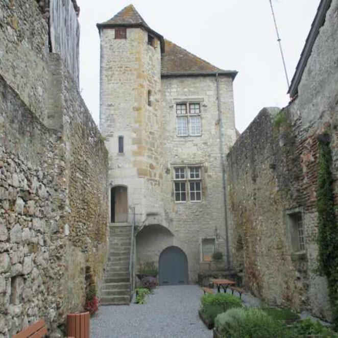 une tour crénelée, une tourelle d’escalier en vis, une cour intérieure et son ancien puits.