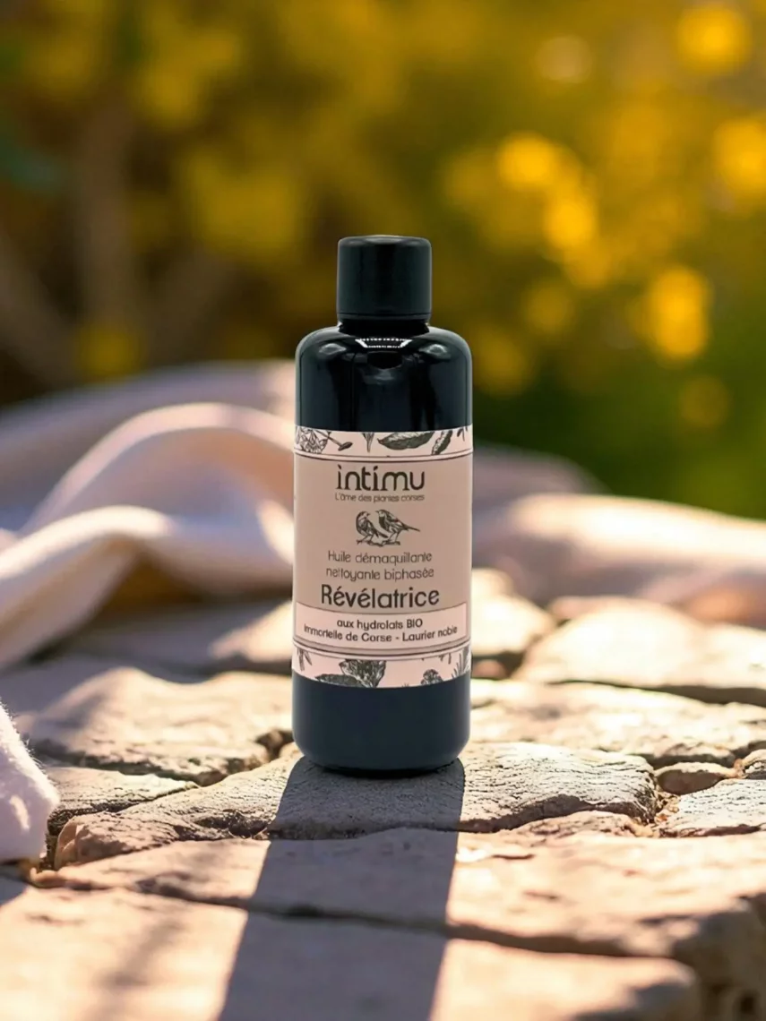 Fabriqué artisanalement en Corse par Intimu. Ingrédients issus de l’agriculture biologique et cueillette locale. Production respectueuse de l’environnement et des équilibres vivants.Conditionnement : Huile démaquillante biphasée Révélatrice – Immortelle & Laurier Bio – 100 ml