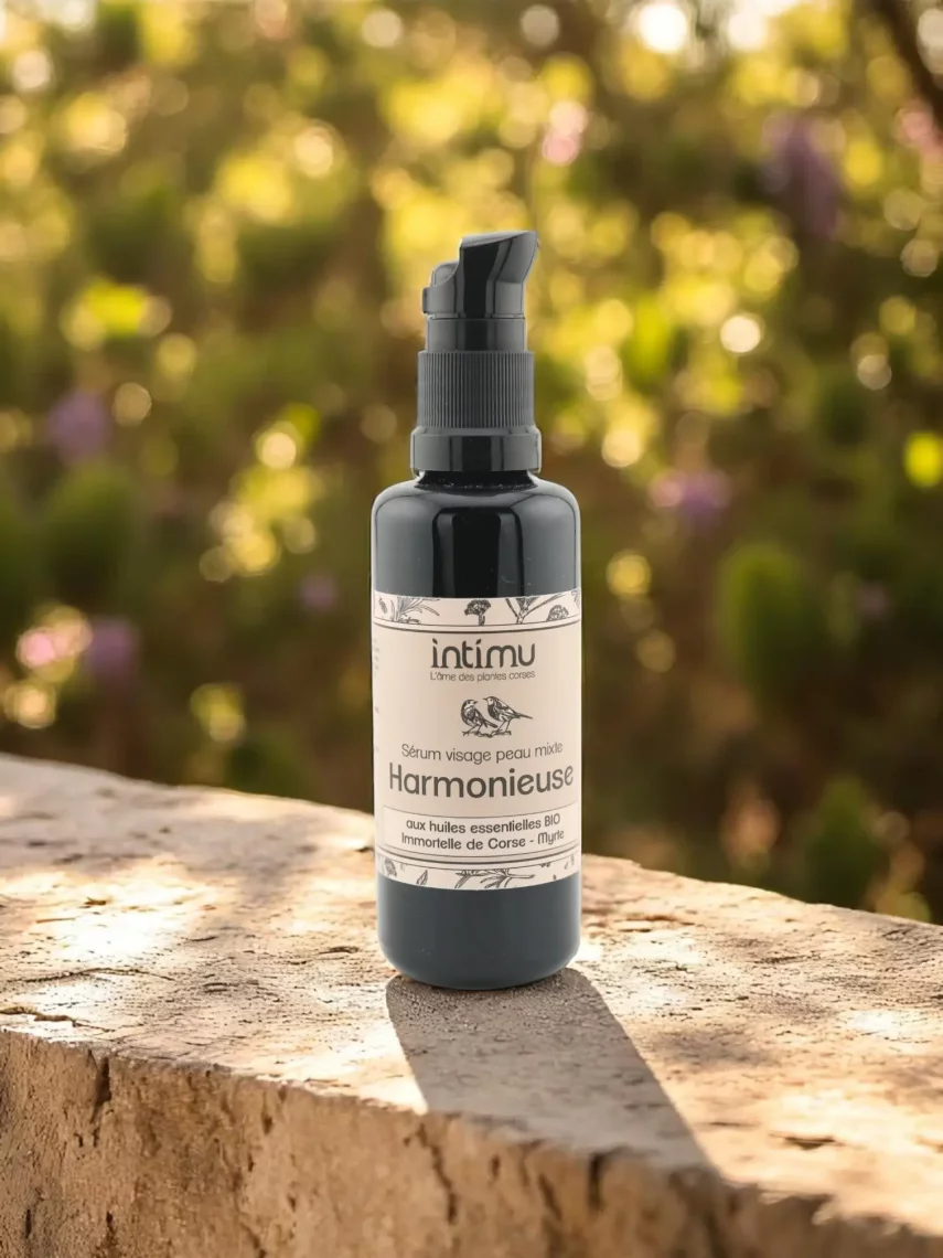Sérum naturel visage pour peaux normales à mixtes, Harmonieuse nourrit, équilibre et prévient les premiers signes de l’âge grâce à une synergie de plantes régénérantes et tonifiantes corses.