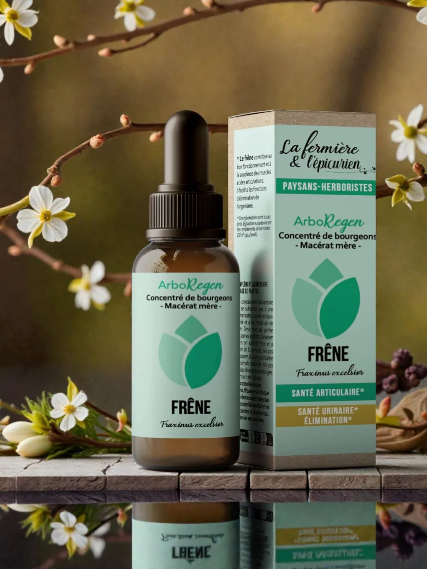 Macérat mère Bio de frêne élaboré par Élise pour favoriser la souplesse articulaire, accompagner l’élimination et soutenir les terrains sujets aux inconforts articulaires.