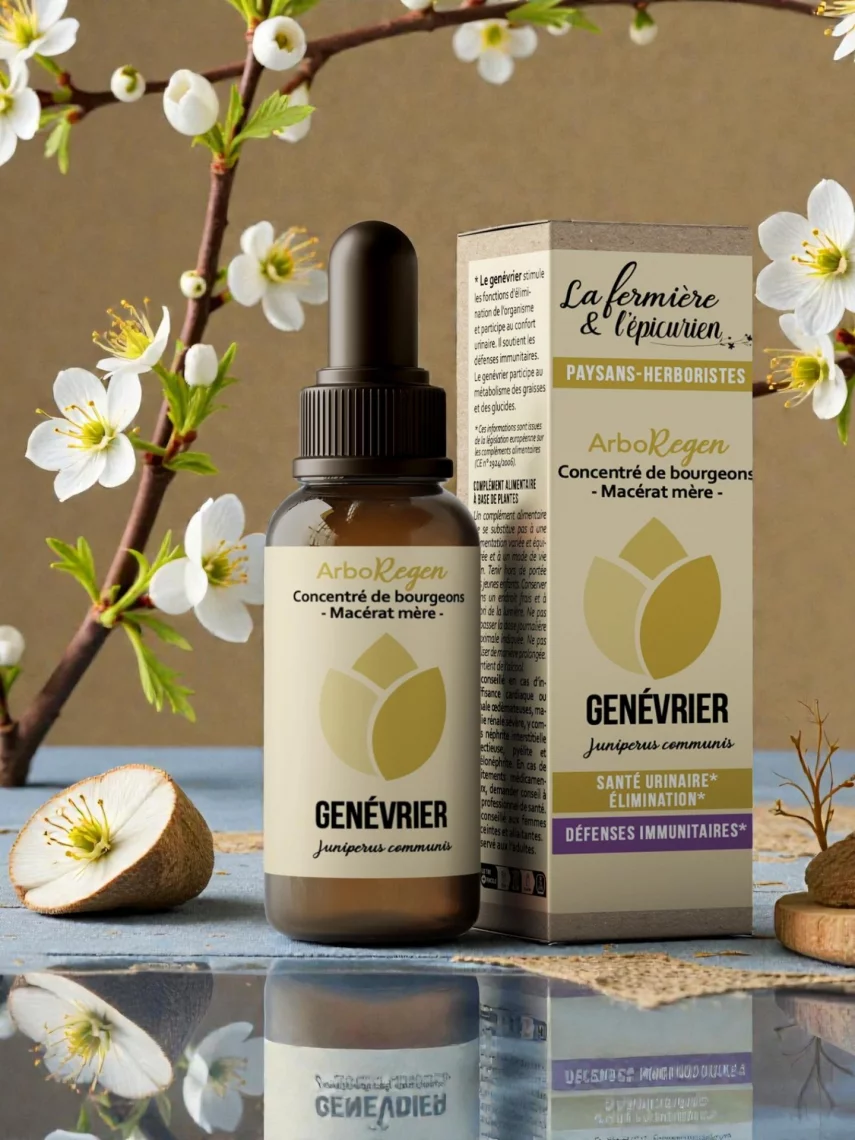 Élaboré artisanalement avec des bourgeons frais de genévrier, du miel d’acacia, de l’alcool vinique et de l’eau de source. Le genévrier est traditionnellement utilisé pour stimuler l’élimination, activer le drainage, accompagner les inconforts digestifs et soutenir les fonctions d’épuration du corps.