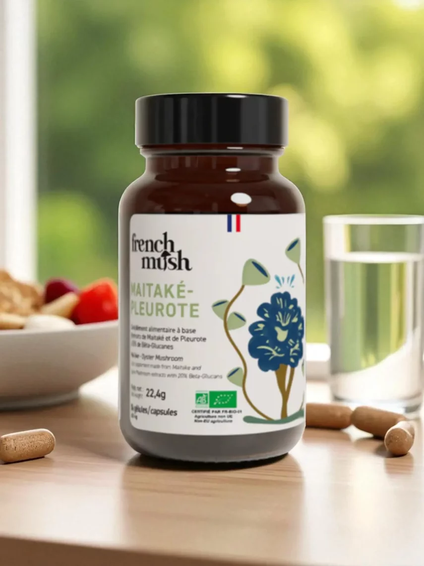 Champignons cultivés biologiquement en Europe, extraits et transformés selon des normes élevées de traçabilité et de culture responsable.Conditionnement : Duo Maitake Pleurote bio FrenchMush gélules satiété glycémie minceur