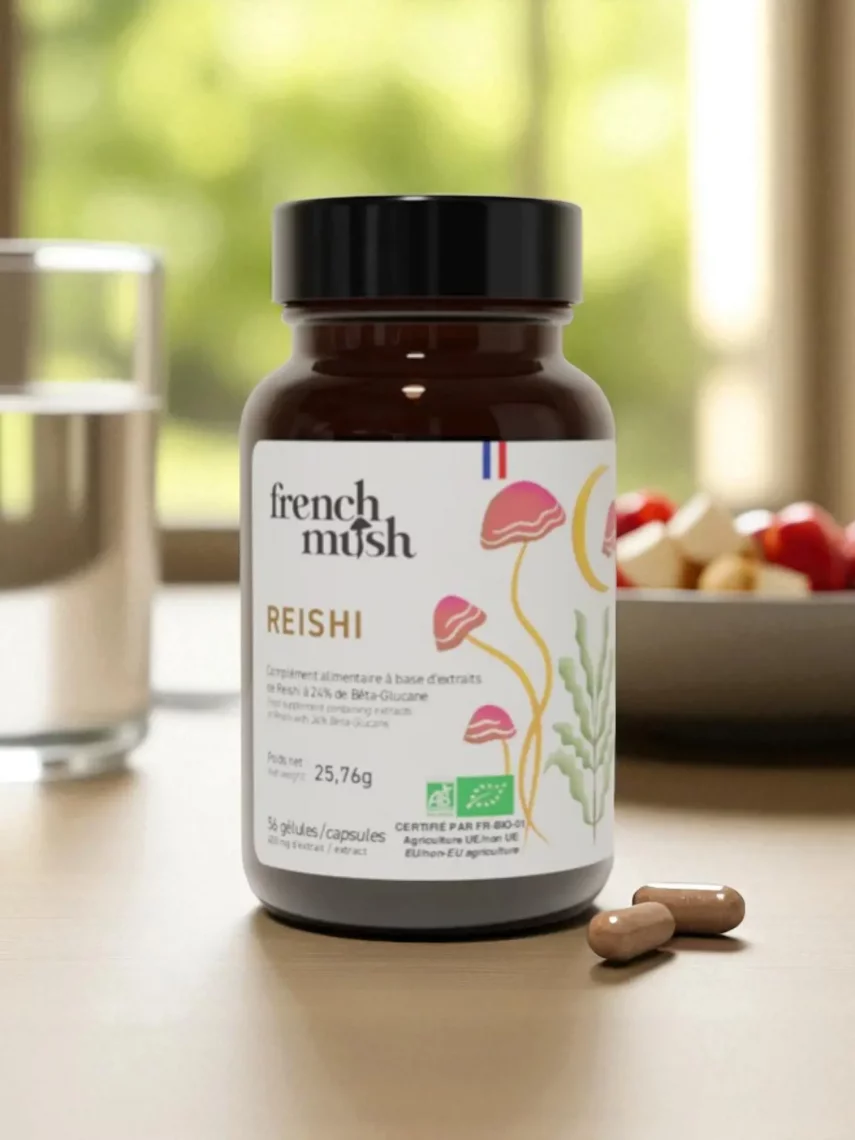 Produit par French Mush en Europe à partir de Reishi biologique (Ganoderma lucidum), extrait ultrasonique standardisé à 30% polysaccharides, 26% bêtaglucanes, 1% triterpènes. Capsules véganes, sans additifs, garanties pures.