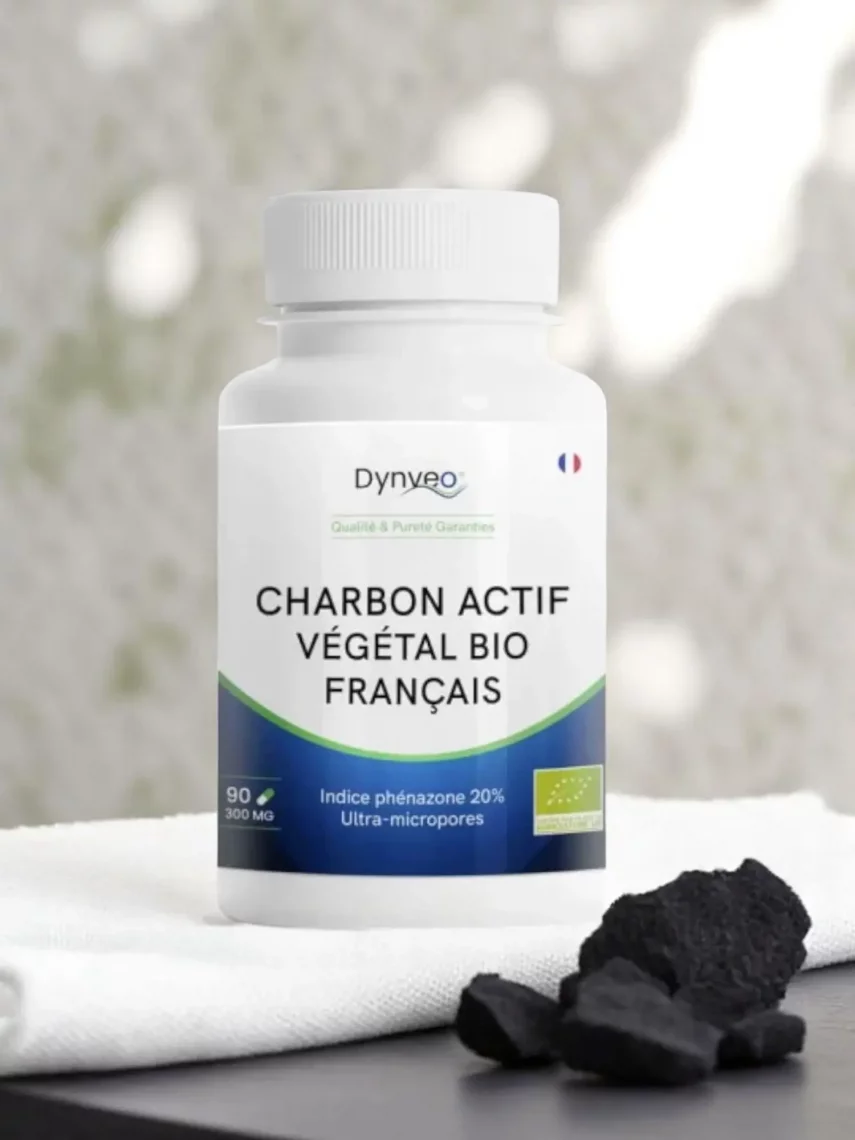 Charbon activé issu de bois de châtaignier bio récolté en Dordogne. Activation à la vapeur, sans produits chimiques. Granulométrie <50 microns assurant une adsorption exceptionnelle. 300 mg de poudre pure par gélule végétale. Sans additifs, sans excipients, non irradié. Produit formulé et conditionné en France par Dynveo.