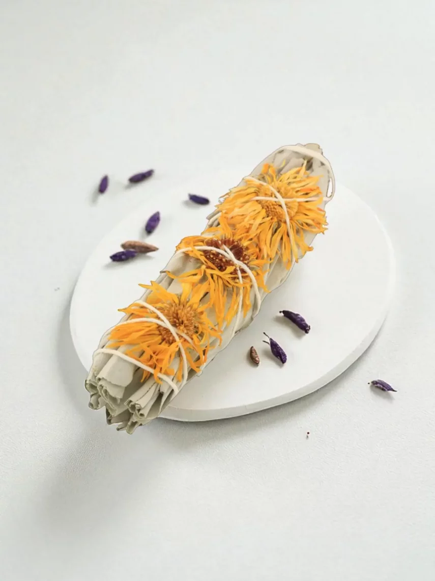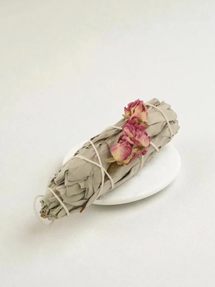 La sauge blanche (Salvia apiana) est utilisée depuis des siècles pour ses propriétés purificatrices et protectrices. En fumigation, elle nettoie les énergies stagnantes, assainit l’air et prépare un environnement propice à la méditation ou au repos. Calendula : symbolise la lumière, reconnu pour ses vertus apaisantes. Rose : évoque l’amour et la douceur, traditionnellement utilisée pour ses bienfaits réconfortants. Lavande : apaise l’esprit et favorise la relaxation grâce à son parfum équilibrant.Plus d'informations sur le produit