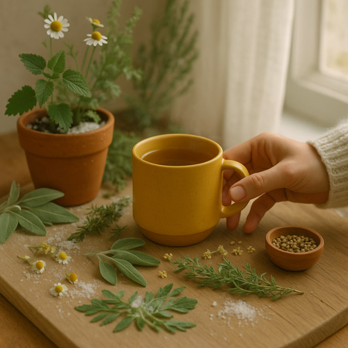Infusions et tisanes ciblées : plantes expectorantes et antiseptiques comme le thym, le plantain ou le sureau pour apaiser la gorge et dégager les voies respiratoires.