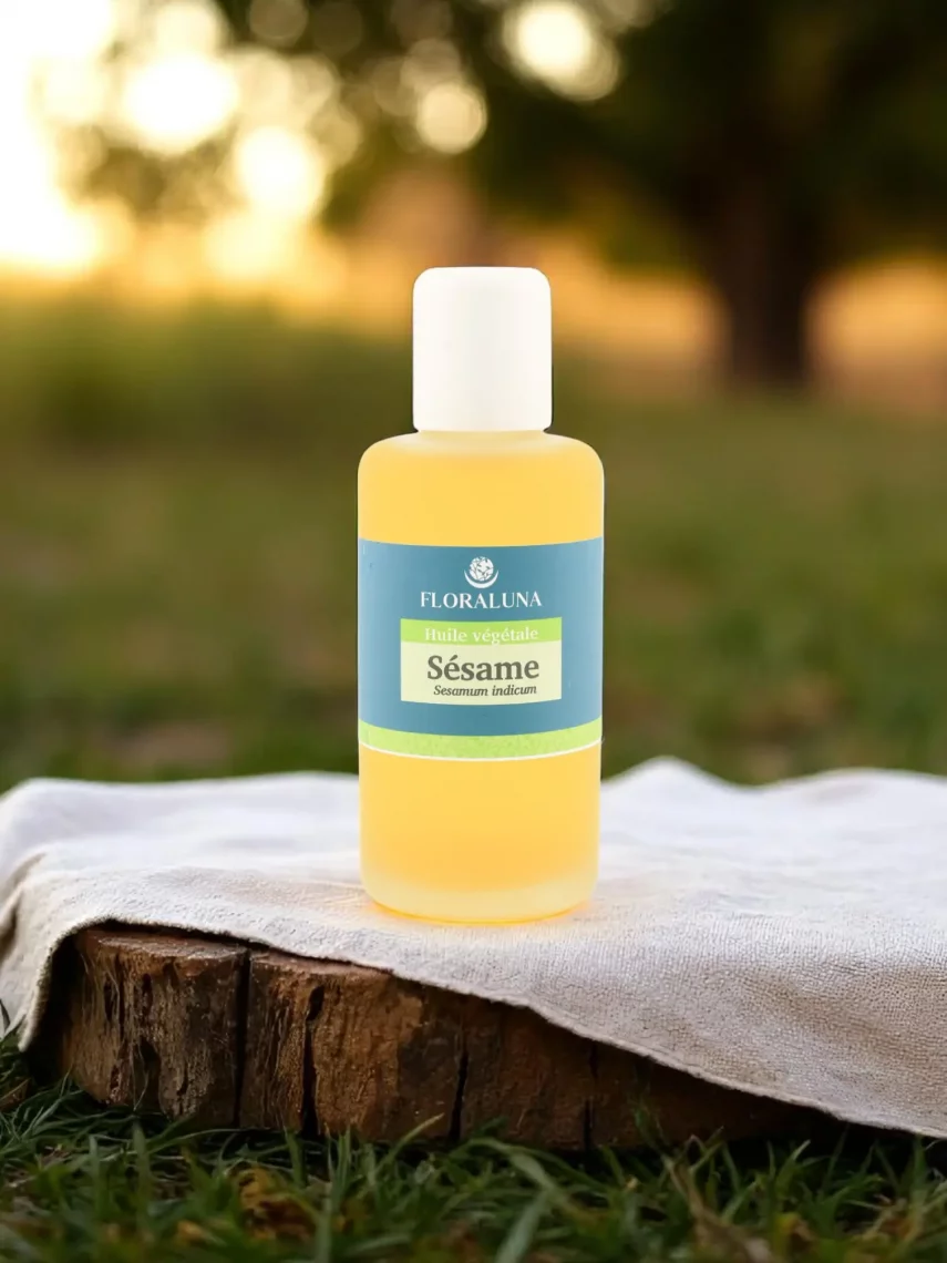 Huile extraite par pression à froid des graines de sésame bio (Sesamum indicum). Nourrissante, assouplissante et chauffante, elle pénètre en profondeur sans laisser de film gras. Très utilisée en massage ayurvédique. Produite et conditionnée par Floraluna. Certifiée Nature & Progrès.