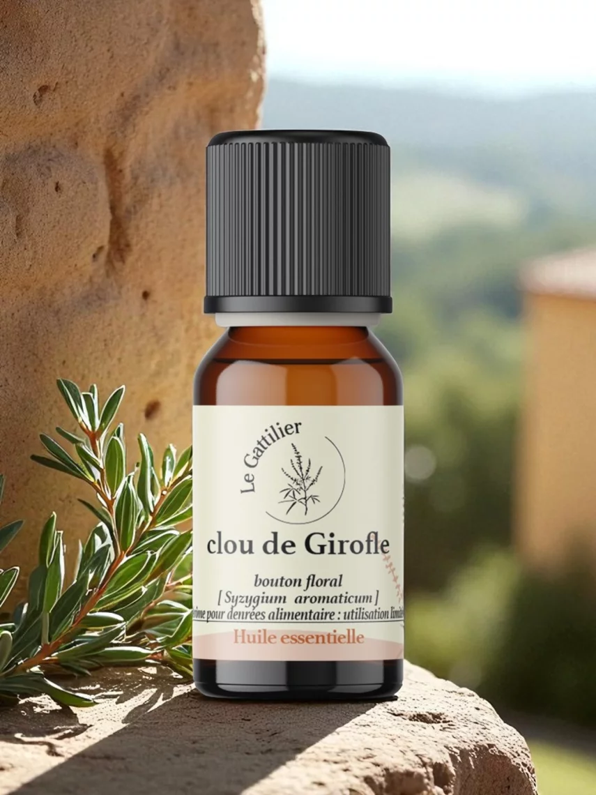 Distillée à partir des clous du giroflier (Syzygium aromaticum), cette huile essentielle 100 % pure et bio est traditionnellement utilisée pour apaiser les douleurs dentaires et soutenir l’immunité. Produit sélectionné et conditionné en Provence par Le Gattilier.