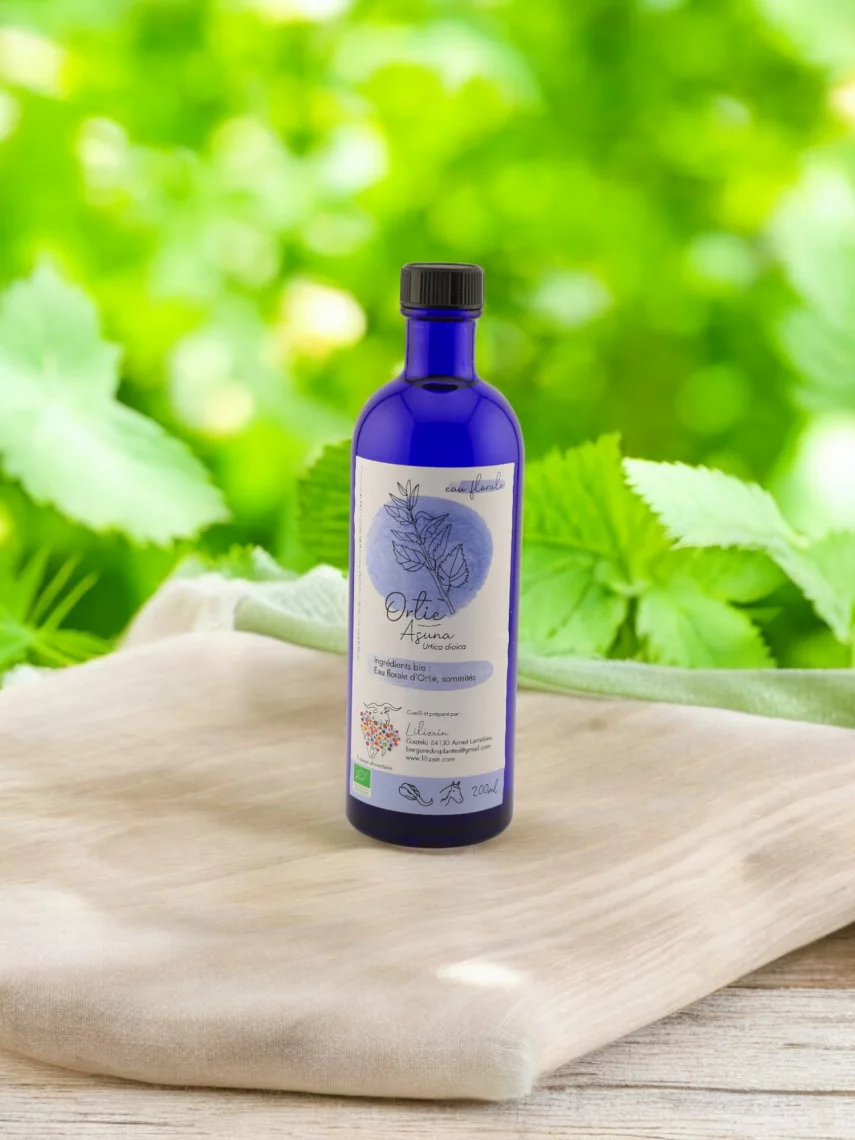 Flacon en verre bleu de 200 ml.Conseils d'utilisation : Hydrolat Ortie Bio Lilizain Pays basque – Purifiant et tonifiant 200 ml