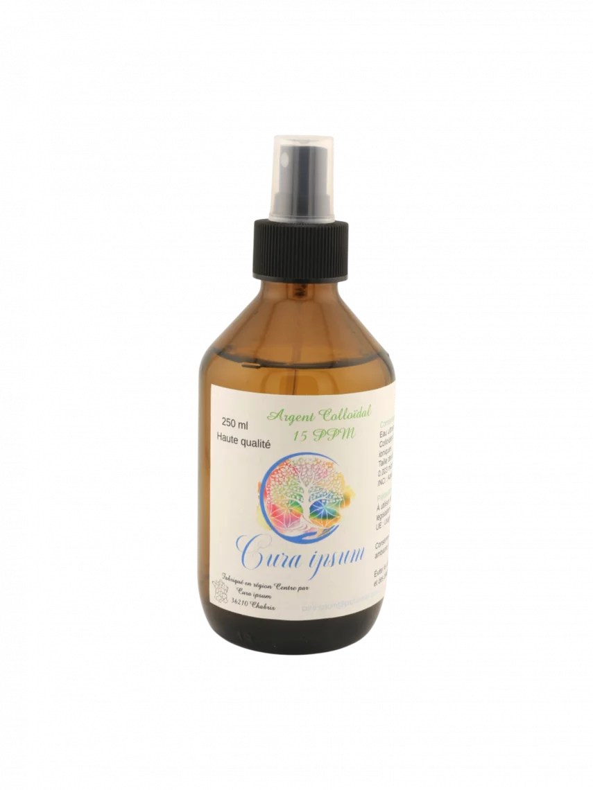 Élaboré en Centre-Val de Loire par Cura Ipsum, cet argent colloïdal est obtenu par électrolyse lente sur argent pur 99,99 % dans de l’eau ultra pure, puis dynamisé par fréquence naturelle 432 Hz. Sans conservateurs ni additifs, il est conditionné en flacons verre ambré de qualité médicale, en 250 ml avec spray ou en 500 ml.