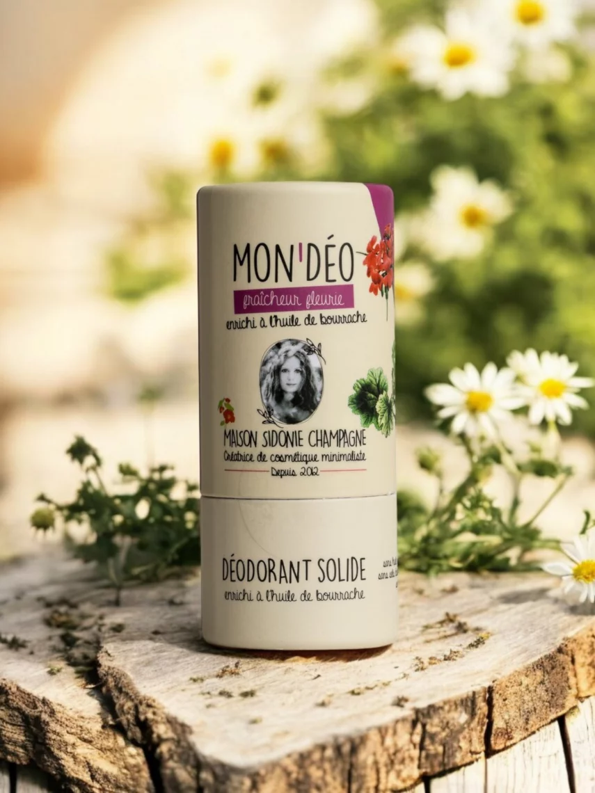 Mon’déo Fleurie est fabriqué artisanalement en Vendée par la Maison Sidonie Champagne. Sa formule associe beurre de karité, huile de coco, huile de bourrache et cire de carnauba bio à du bicarbonate et de l’amidon de maïs bio. Parfumé uniquement avec des huiles essentielles bio de palmarosa et de géranium, il procure une fraîcheur florale élégante et douce. Disponible en stick carton recyclable 50 ml ou pot verre consigné 100 ml.