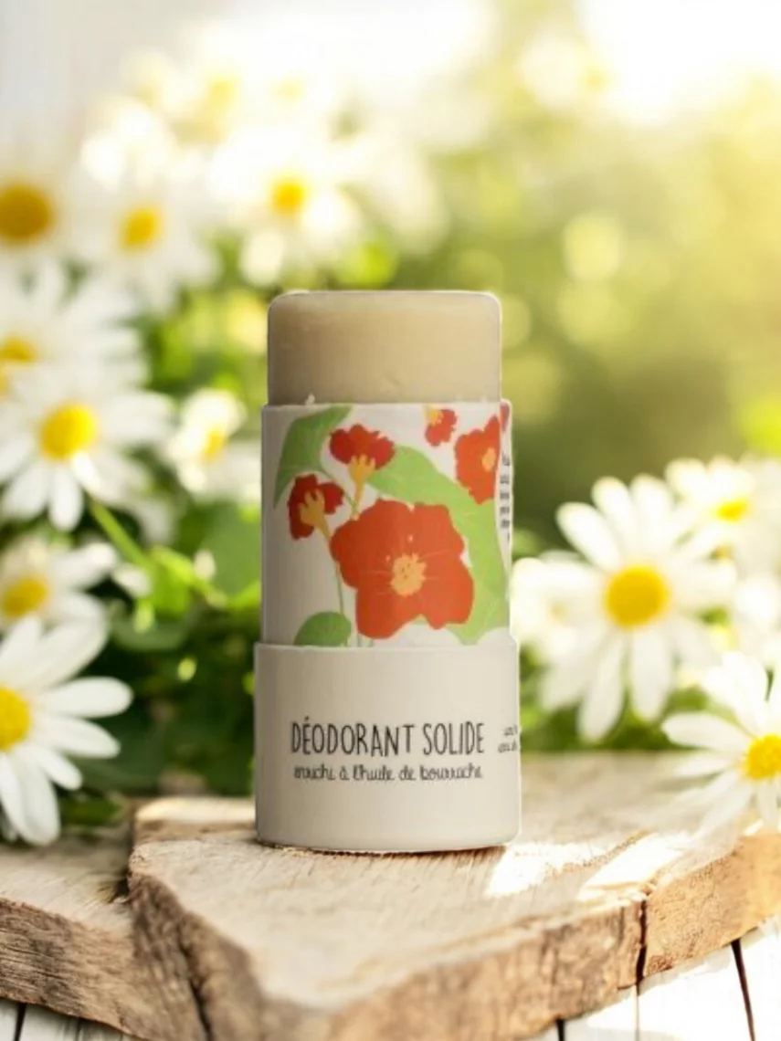 Produit fabriqué artisanalement en Vendée par la Maison Sidonie Champagne. Huile de bourrache issue d’une filière locale (Ferme de Bonneville, près de La Rochelle).Conditionnement : Déodorant solide bio Mon’déo Fleurie – Palmarosa & Géranium – Stick 50 ml & Pot 100 ml – Maison Sidonie Champagne