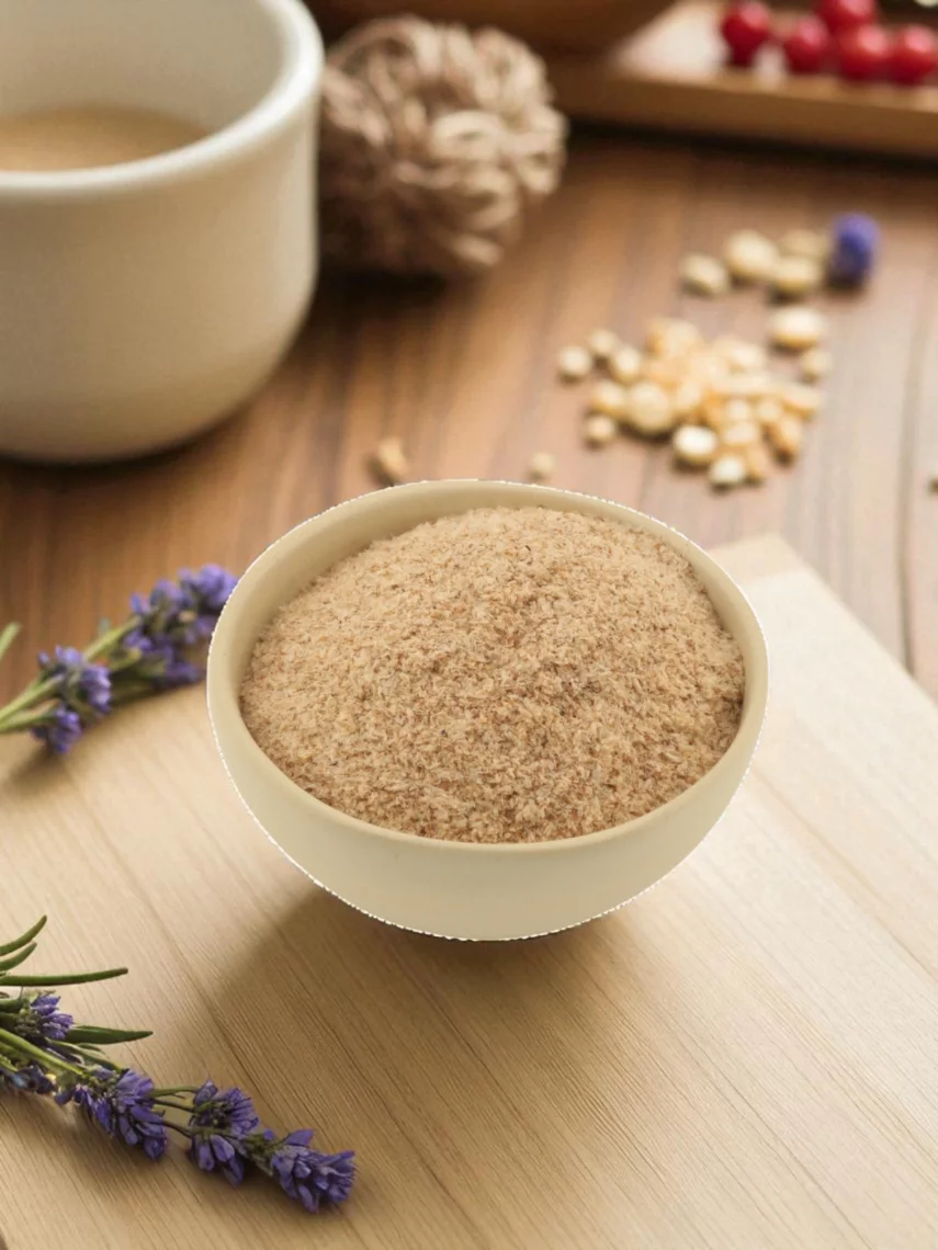 Le psyllium est une source exceptionnelle de fibres solubles (mucilage représentant 25–30% du poids de la graine) qui gonflent au contact de l’eau pour former un gel viscous. Il agit comme laxatif de lest, régule le transit, soulage la constipation et la diarrhée, tout en aidant à réguler la glycémie, à réduire le cholestérol LDL, et à soutenir la santé cardiovasculaire. Il joue aussi un rôle prébiotique en nourrissant la flore intestinale.