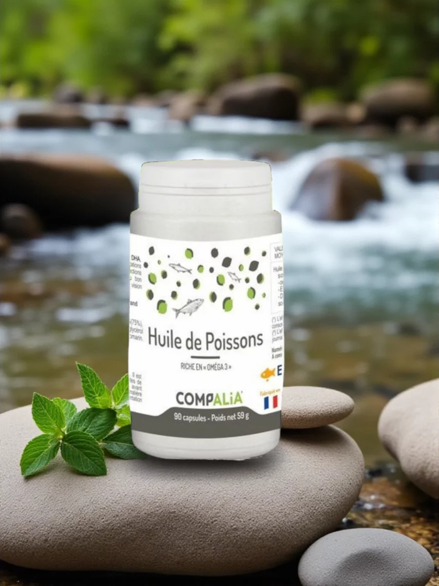 Formulé et fabriqué en France par Compalia. Huile issue de poissons sauvages certifiée qualité pharmaceutique, purifiée pour éliminer les métaux lourds et stabilisée contre l’oxydation.Conditionnement : Huile de poissons 34/24 TG – Oméga-3 EPA DHA – Forme naturelle – Compalia