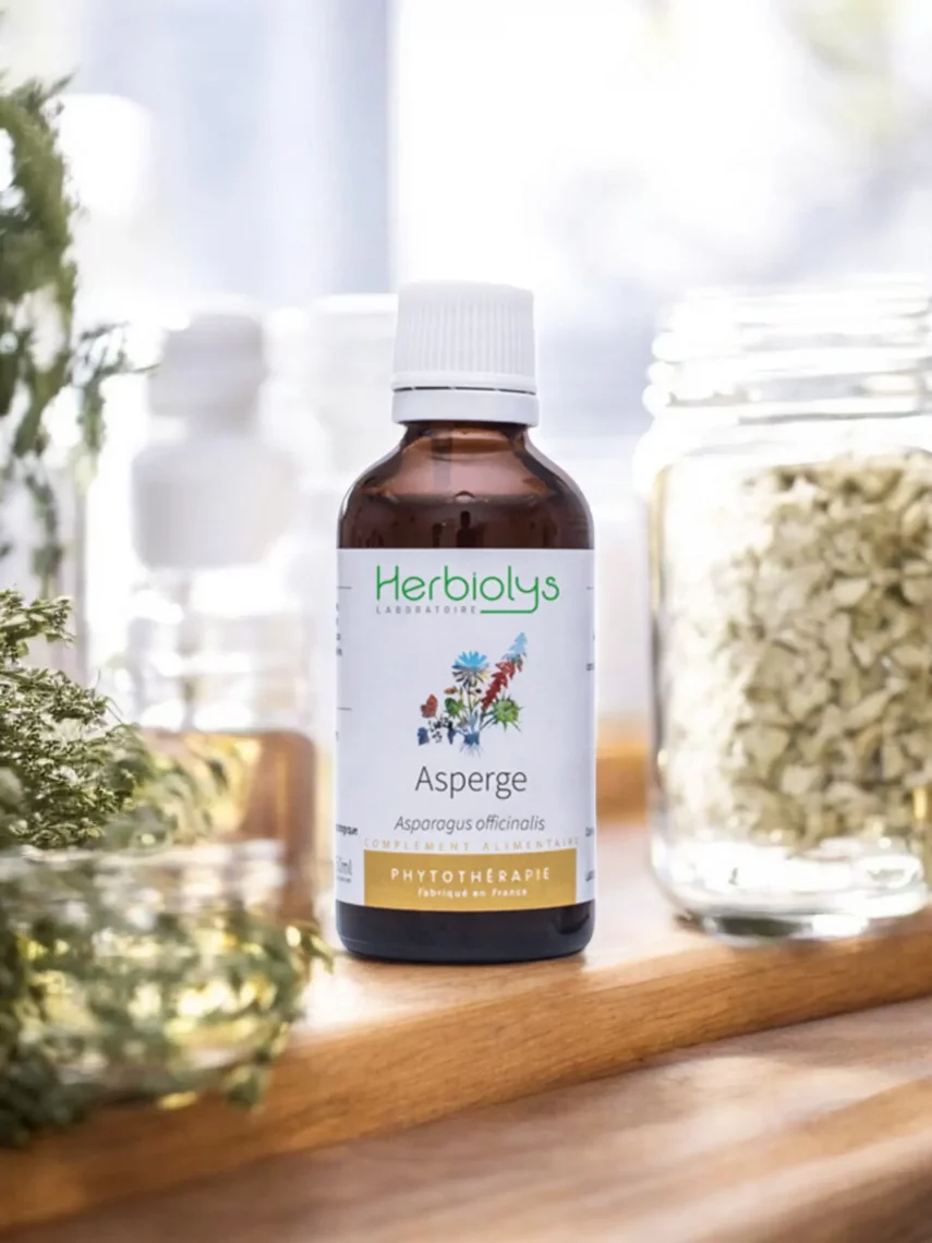 Flacon en verre ambré de 50 ml avec compte-gouttes, préservant l’intégrité des actifs sensibles à la lumière.Conseils d'utilisation : Asperge Bio – Extrait de Plante Fraîche – Drainage Rénal et Confort Urinaire