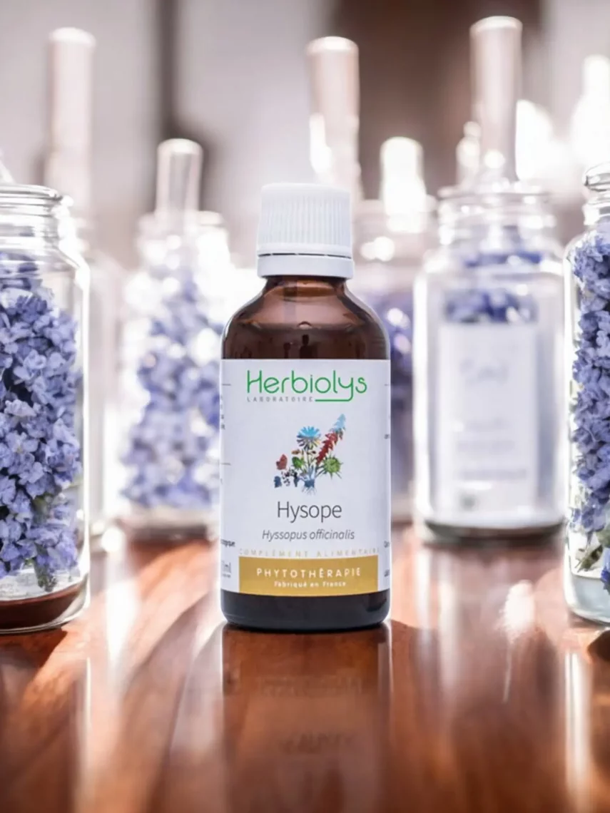 Extrait bio d’hysope fraîche, plante aromatique utilisée traditionnellement pour dégager les voies respiratoires et soutenir la digestion.