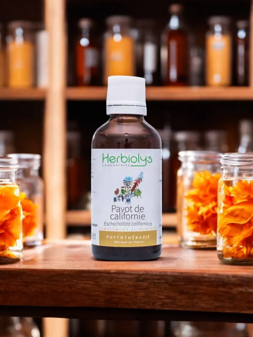 Extrait bio de pavot de Californie frais, utilisé pour calmer l’agitation mentale, réduire les réveils nocturnes et favoriser un sommeil réparateur.