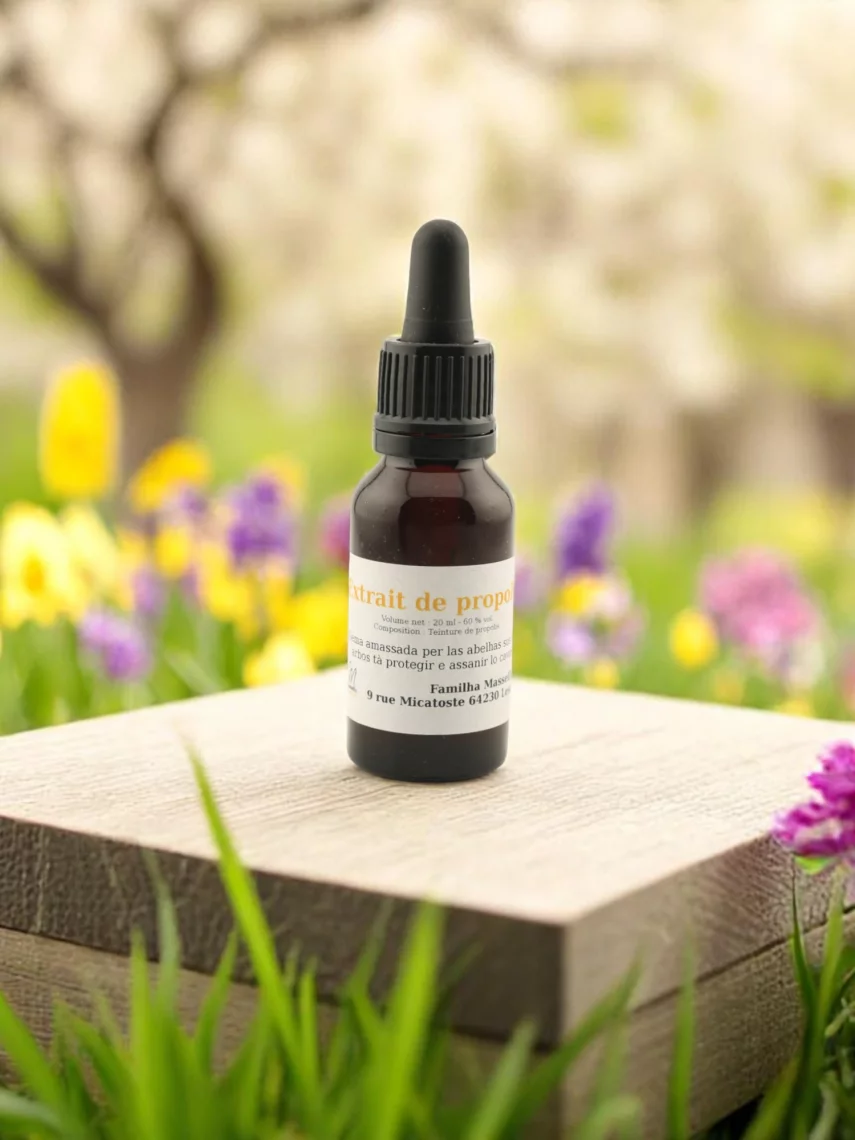 Extrait de propolis concentre, formule hydroalcoolique titree 60 pourcent, prepare dans les vallees pyreneennes. Fabrication artisanale soignee pour conserver l’integralite des actifs. Flacon compte gouttes pratique pour un usage quotidien.