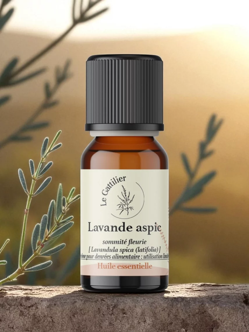 Huile essentielle de Lavande aspic distillée en Provence, riche en composés actifs reconnus pour leurs vertus cutanées et respiratoires tout en demandant une utilisation attentive.