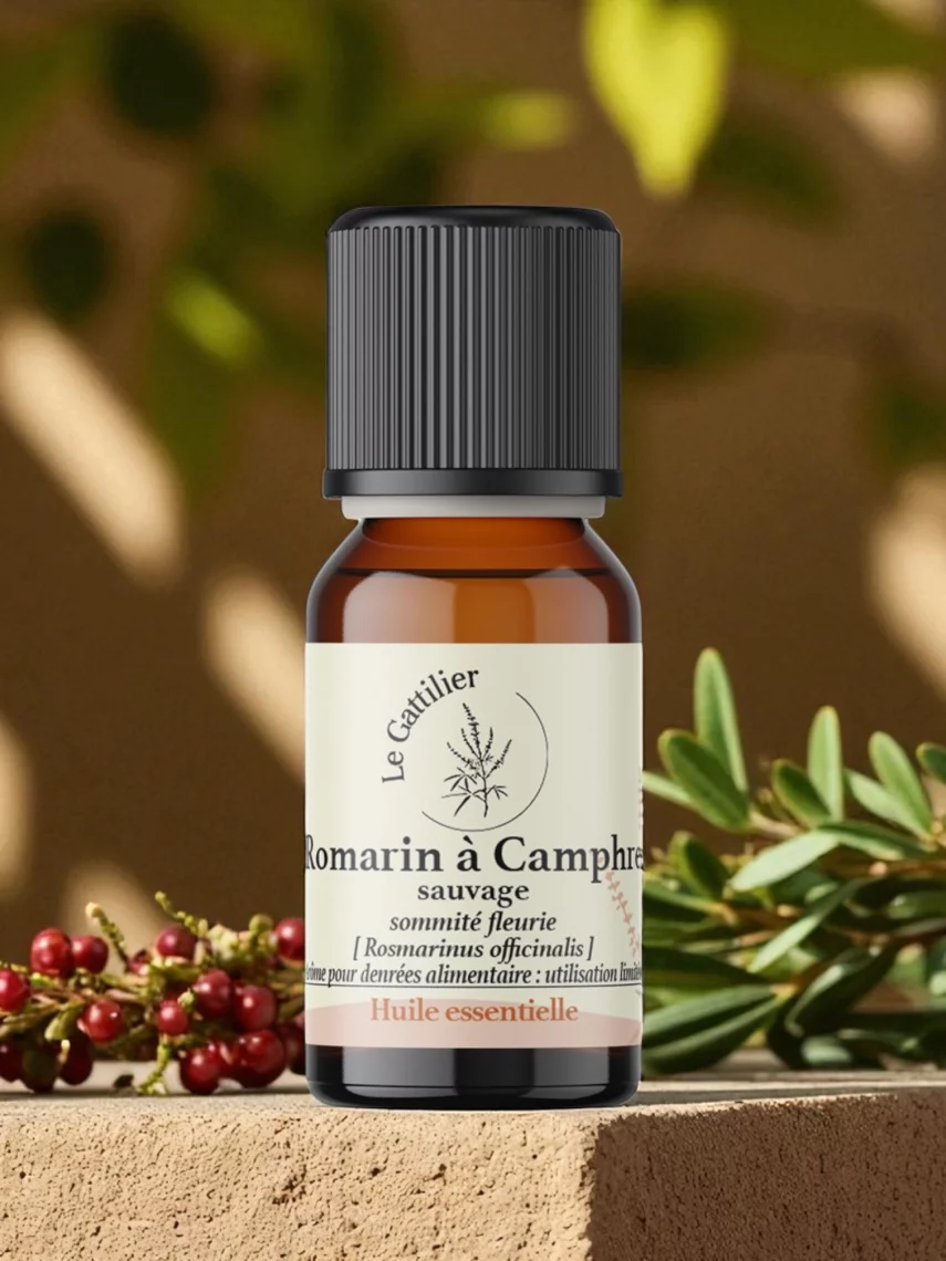 Huile essentielle 100 % pure et naturelle de Rosmarinus officinalis CT camphre (Romarin officinal). Composition biochimique majoritaire : camphre (15-25 %), 1,8-cinéole (10-20 %), bornéol, camphène, -pinène.Origine : Huile essentielle Romarin camphré sauvage Bio Alpes-de-Haute-Provence 5 ml