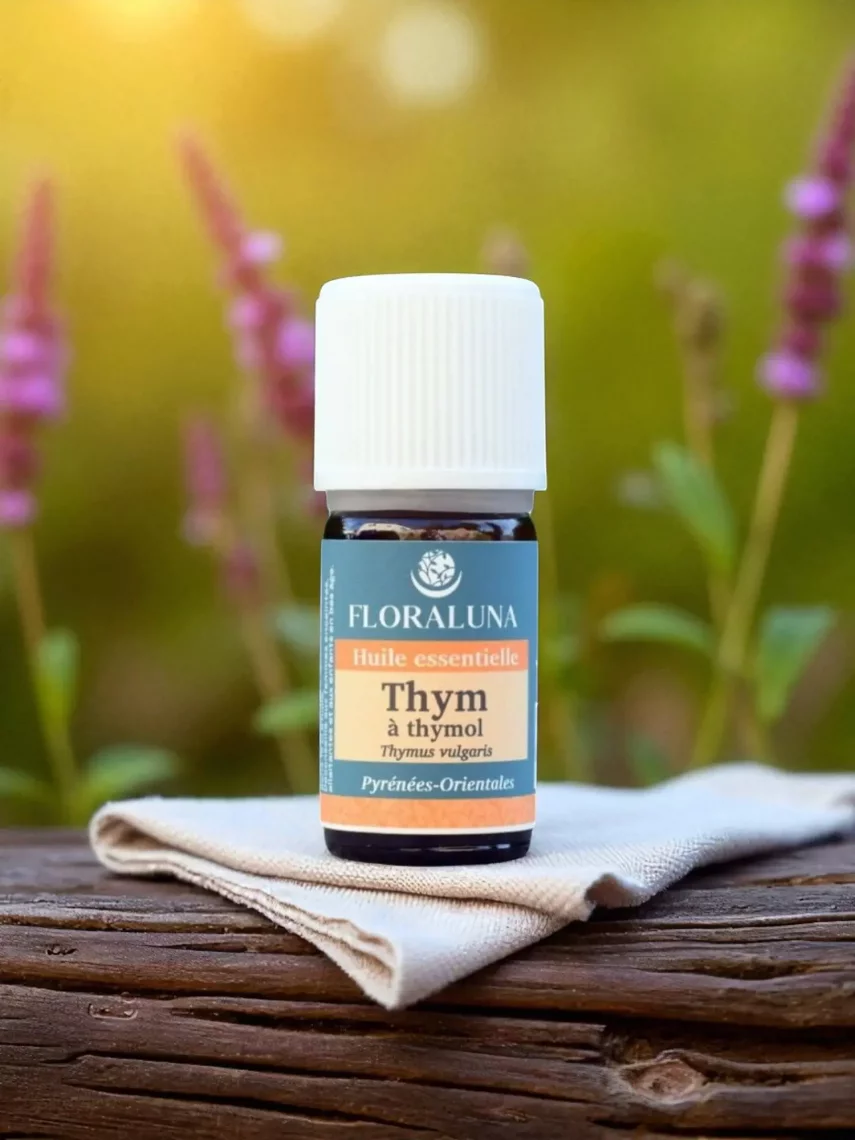 Distillée à partir des sommités fleuries de Thymus vulgaris CT thymol bio, cette huile essentielle est un anti-infectieux majeur à large spectre. Produit puissant et exigeant, utilisé avec précaution. Élaboré par Floraluna. Certifiée Nature & Progrès.