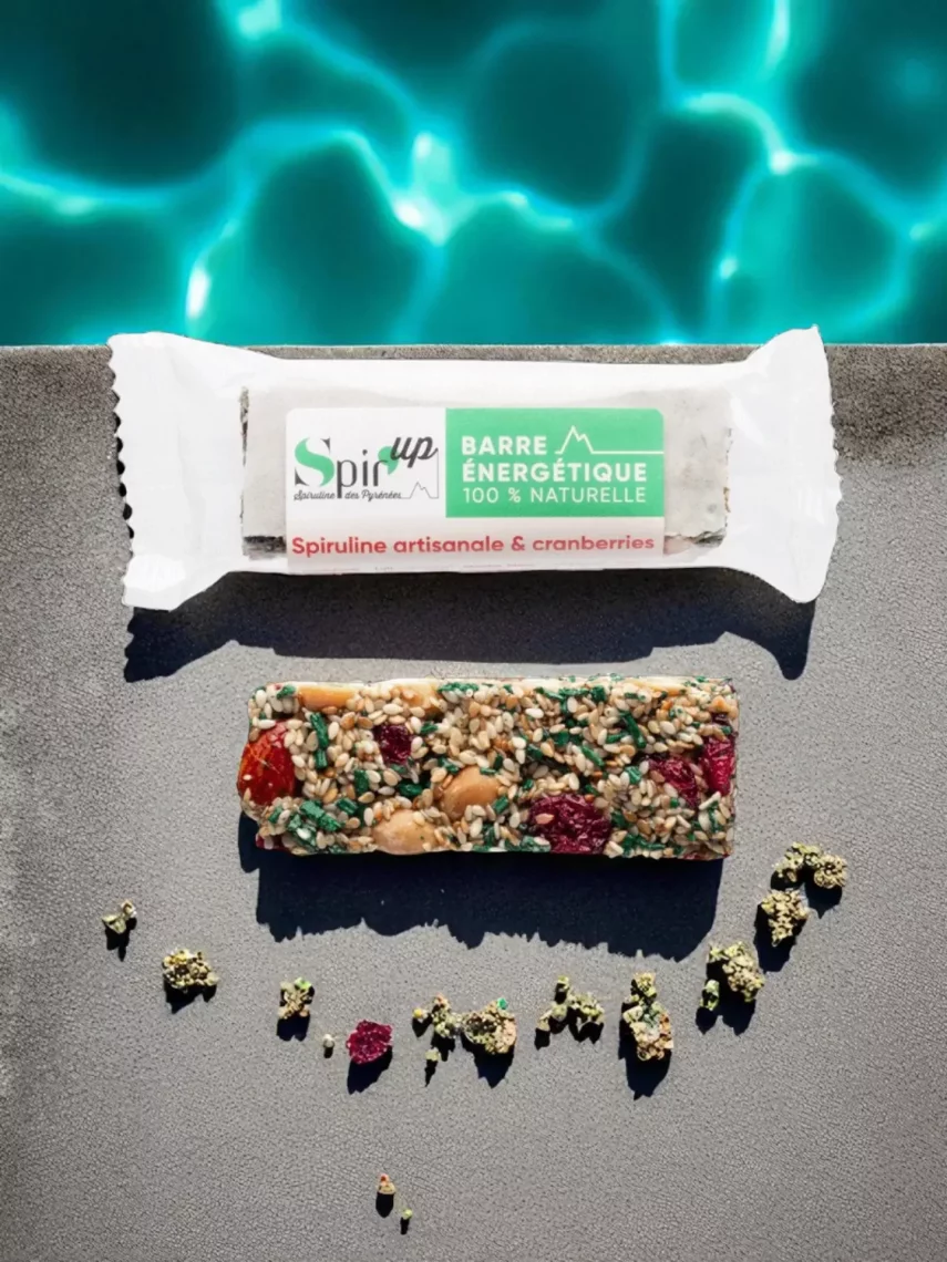 Produit à Spir’Up (PyrénéesAtlantiques), barre contenant spiruline bio (9%), miel, sésame, amandes, cacahuètes et cranberries bio. Sans cuisson, sans conservateur ni arôme artificiel. 541 kcal/100g.