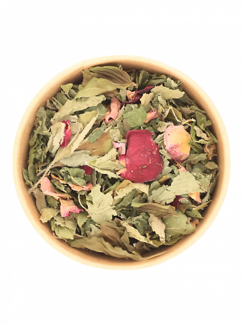 Basilic sacré (Ocimum sanctum), menthe bergamote (Mentha × piperita citrata), mélisse (Melissa officinalis), ortie (Urtica dioica), rose (Rosa sp.).Origine : Tisane Aphrodite 20 g bio – La Fermière et l’Épicurien